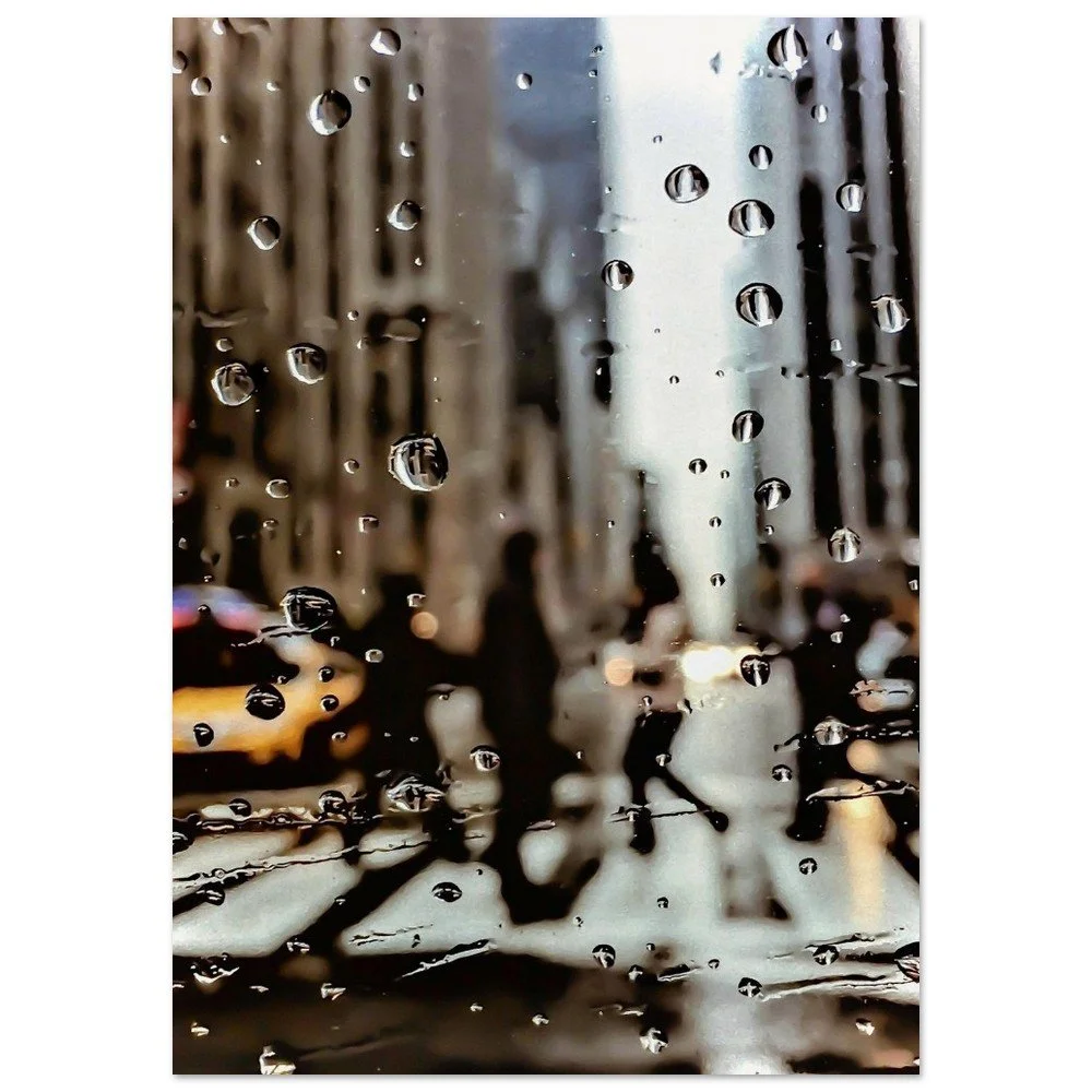 Unique, contemporary, urban print. Amidst the urban hustle and bustle, a sophisticated view of NYC taken behind the window of classic yellow taxi.